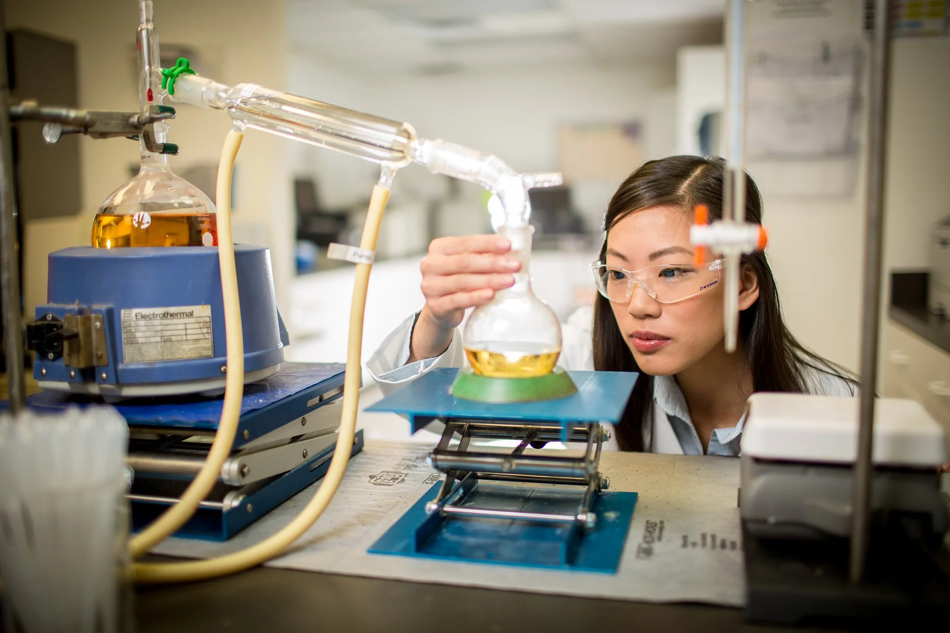Manufacturing lifestyle photo of a woman testing chemicals in a flask in a laboratory. View fullsize