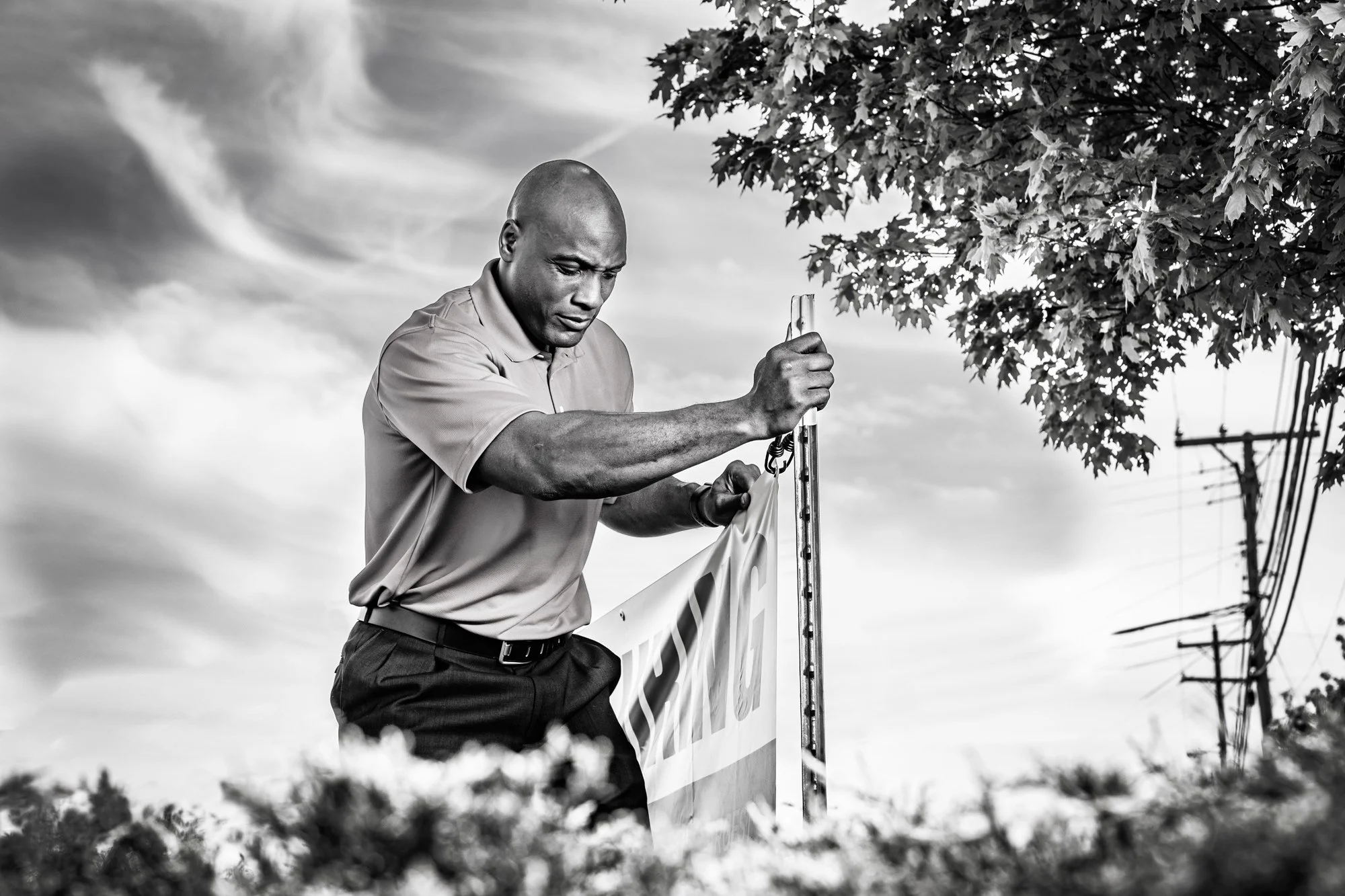 Black and white lifestyle photo of a man planting a signpost to display a banner in front of a store. View fullsize